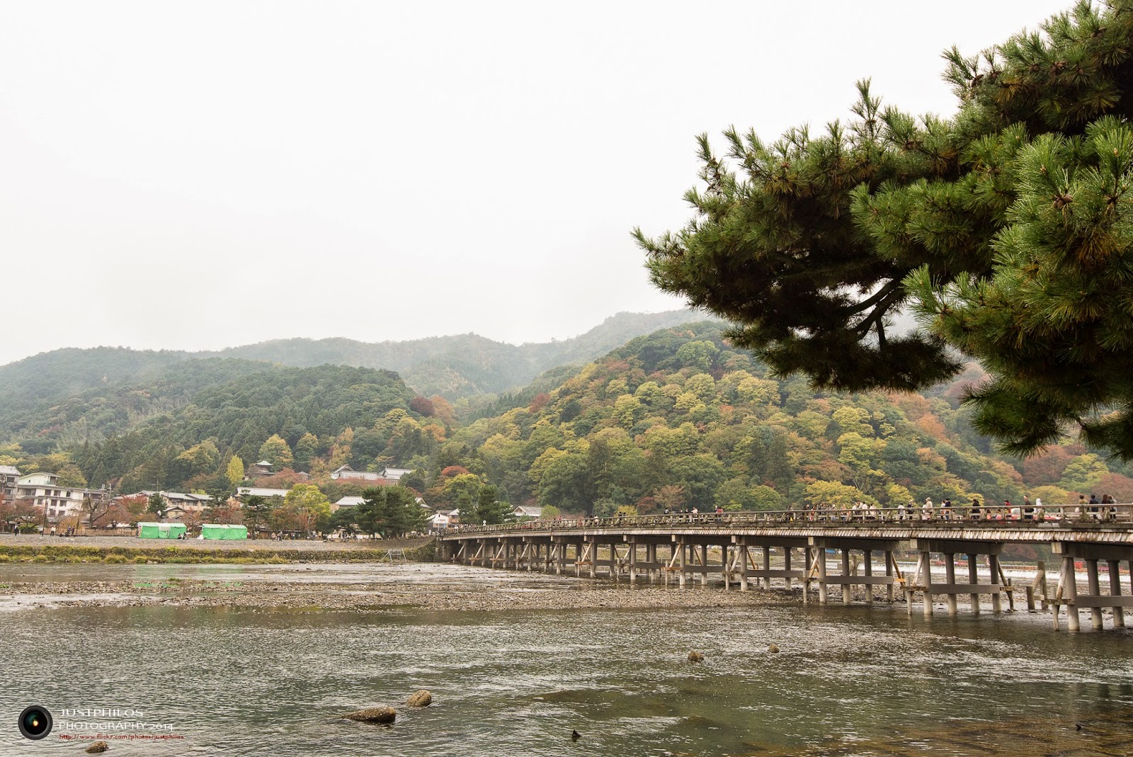 繼續沿著道路與指標前進,不需要多少時間就可到達渡月橋頭。因為是旺季時間,橋上的人潮和車潮都相當可觀,因此我選擇在橋邊沿岸取景避開人潮,比較可惜的是因為天氣不是很好(此時恰好雨勢有稍停),顯得成果會有些昏暗。